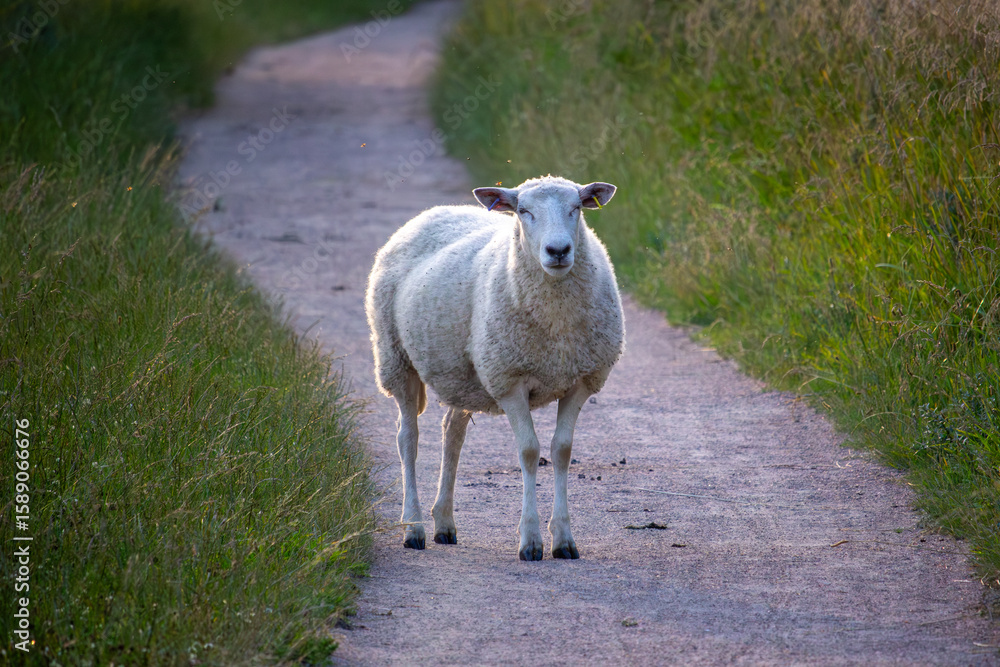 Curious Sheep Standing Alone on a Country Path at Sunset