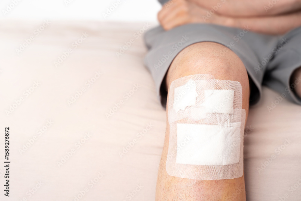 Close-up view of a man's bandaged knee with adhesive patch after injury, sitting on bed. Concept of trauma care, wound protection and medical recovery. Banner. Copy space