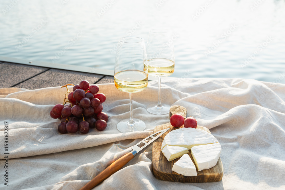 Two glasses of white wine with cheese and grapes on a pier at sunset.