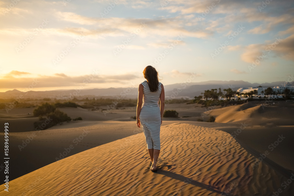A woman strolls on sand dunes as the sun sets, casting warm orange hues across the horizon, creating a serene atmosphere.