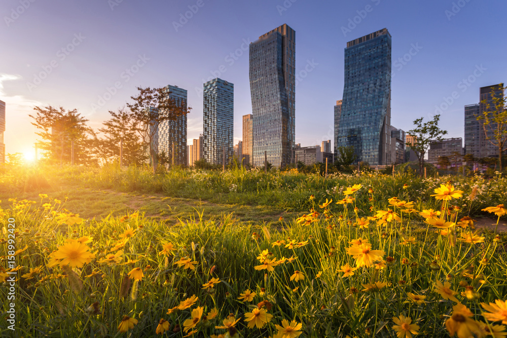 Traditional and modern architecture of seoul city in sunset, central park in songdo International business district, Incheon South Korea.