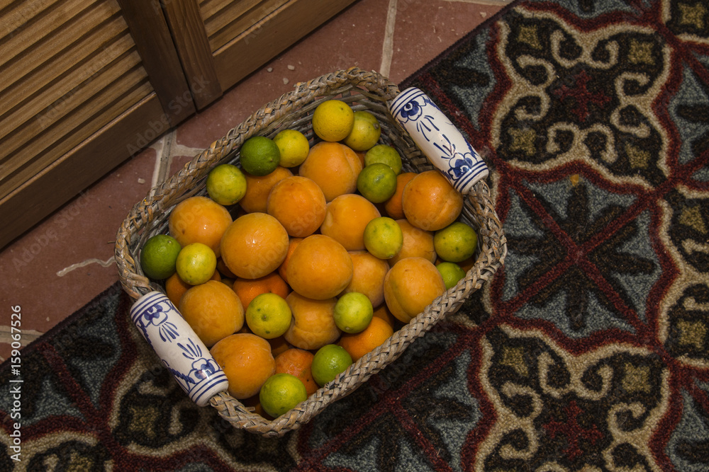 Apricot, oranges and limes in wicker basket with ceramic hand painted handles