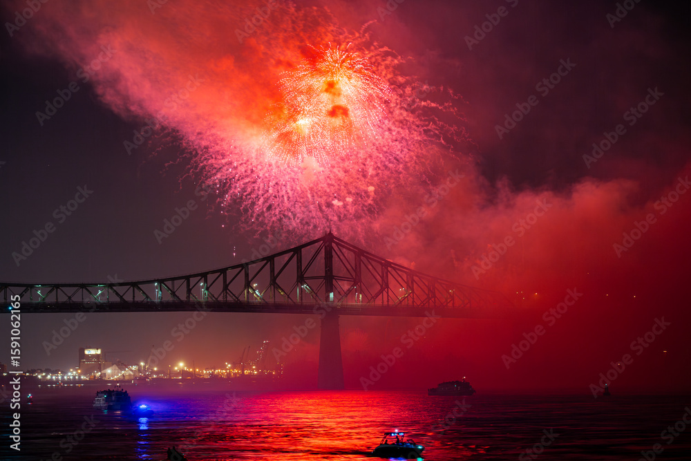 Drone flight through holiday fireworks above water with reflection on the black sky background