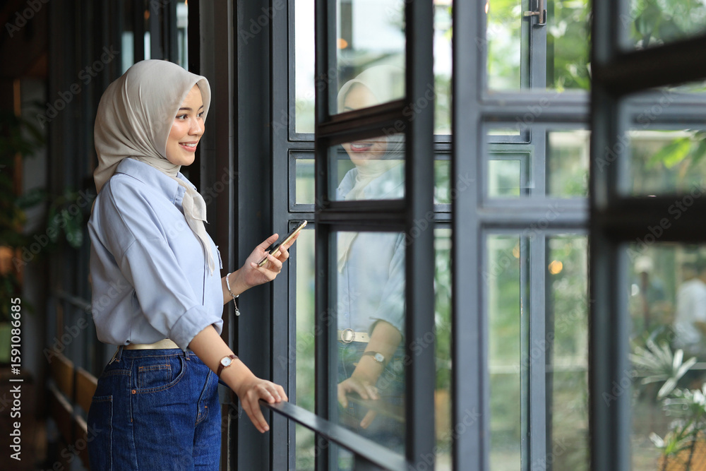 Asian Muslim Businesswoman in Hijab Holding Smartphone while Standing by Window