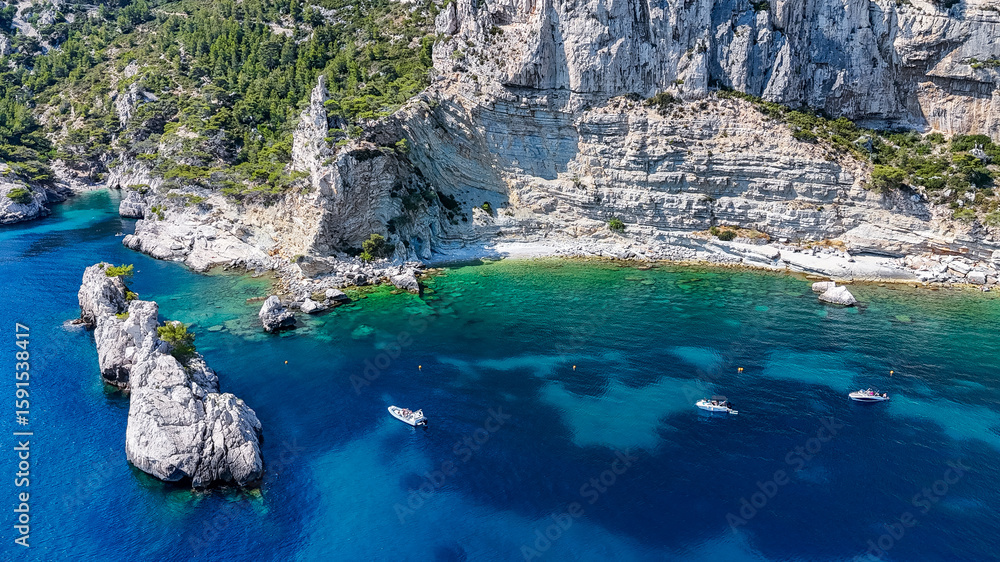Plan de vue aérien sur un bateau en plein milieu de la mer Méditerranée vers des falaises avec une eau bleue et turquoise