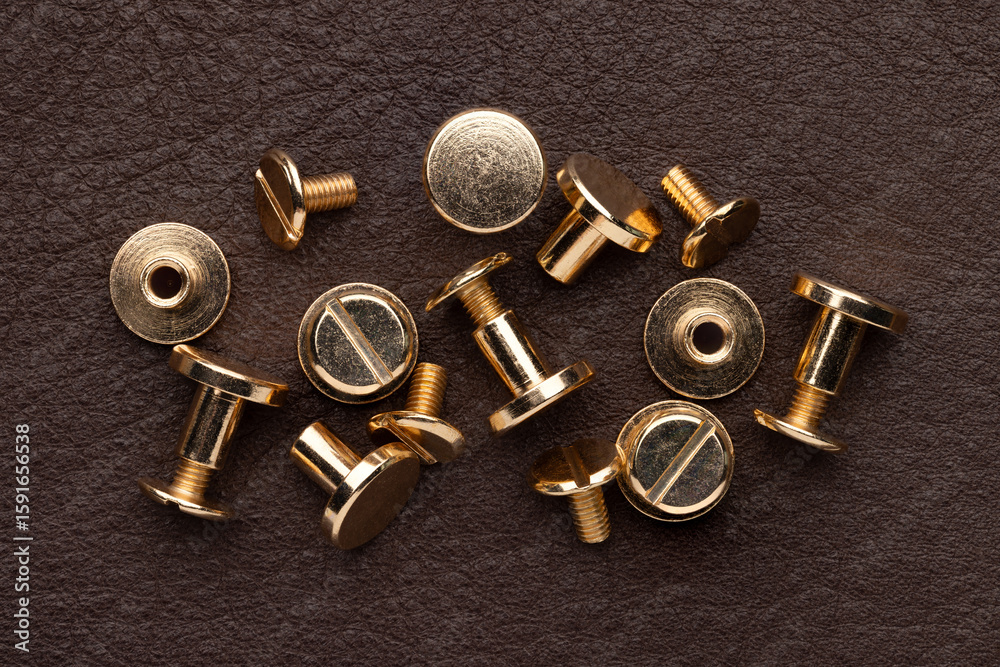 Rivets and screws for leather goods made of yellow metal. Background, brown leather texture.