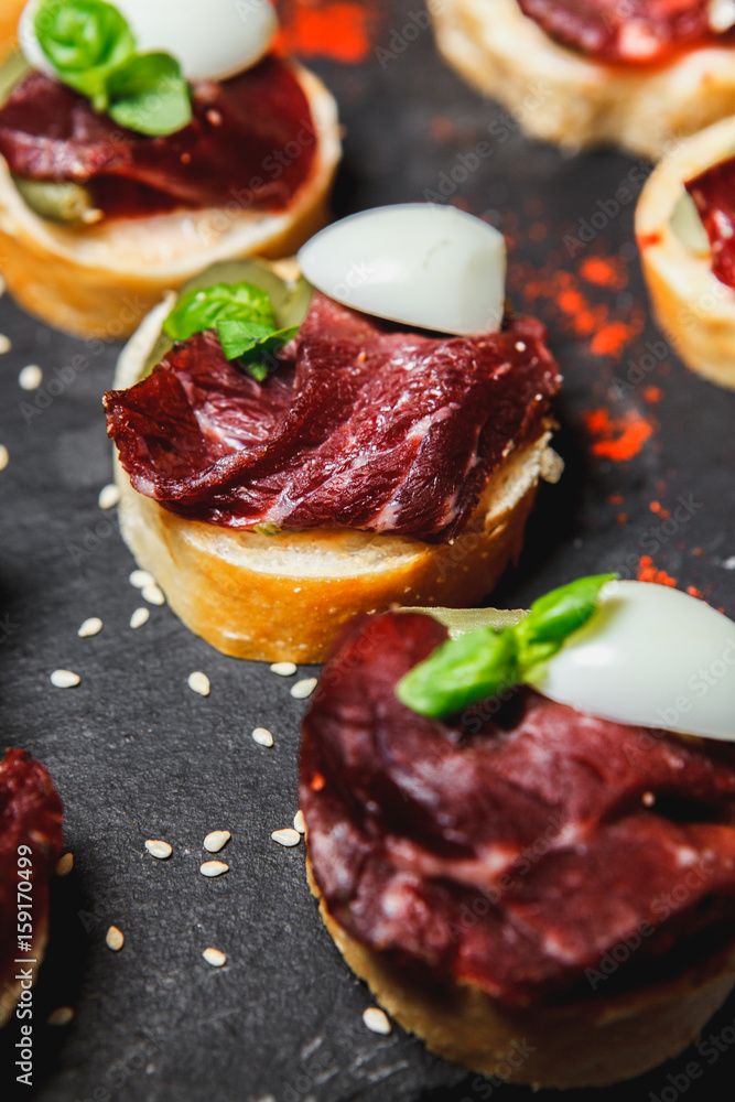 snacks with meat and vegetables. Tapas with salmon and pickled cucumber. Prosciutto with pears and arugula