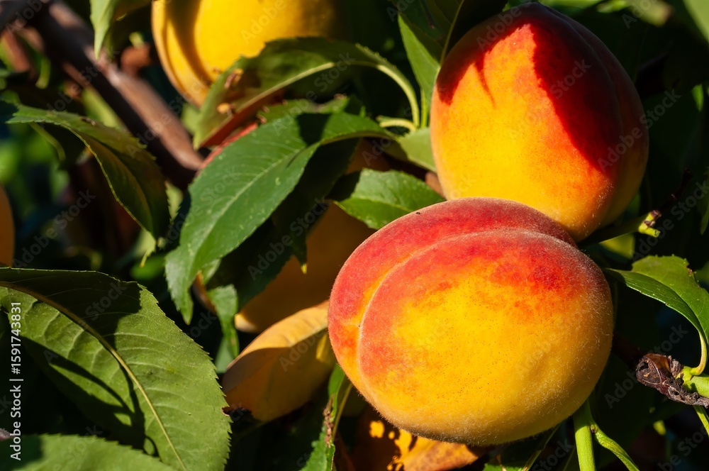 Beautiful close-up of juicy, ripe peaches hanging from a tree branch under the sunlight.