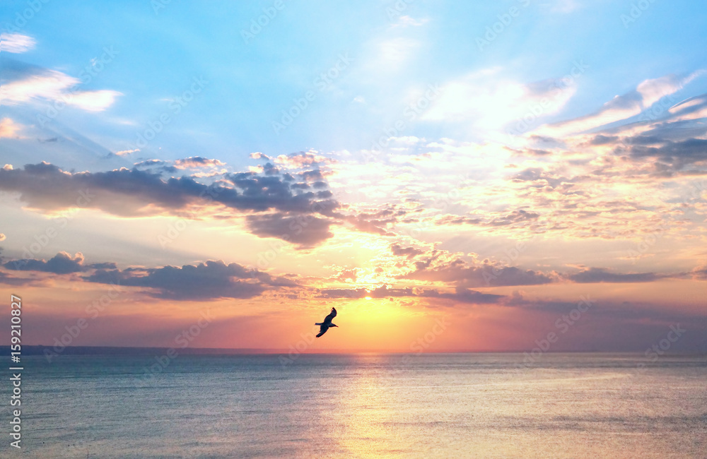 A seagull is flying in the sky above the sea at dawn. Beautiful sky with clouds at sunset.
