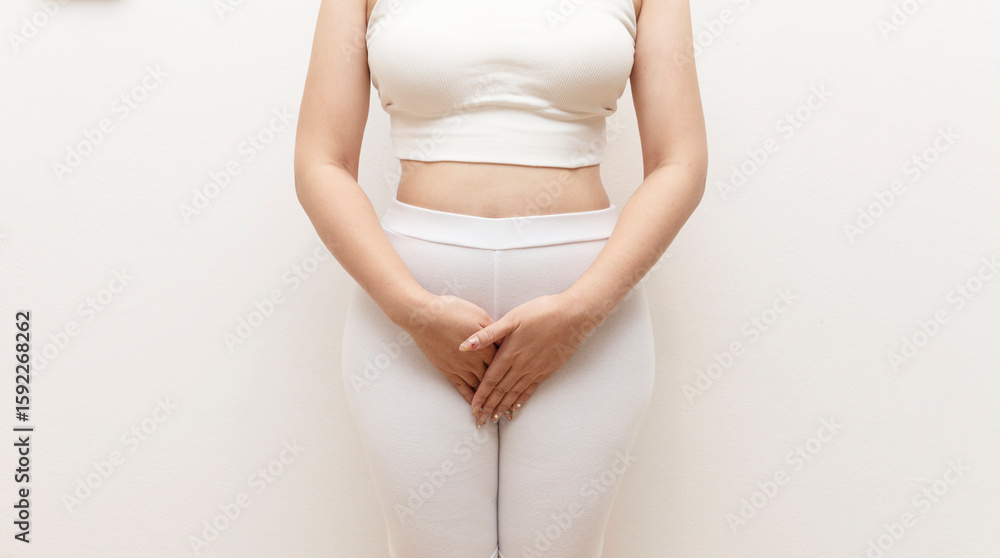 Midsection of a woman in white clothes holding her pelvic area, possibly indicating bladder pain, menstrual cramps, or urinary issues.
