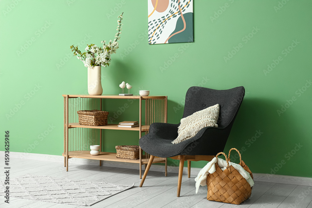 Interior of stylish living room with grey armchair and blooming tree branches on table