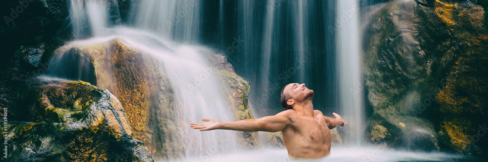 Man relaxing with freedom banner. Person with open arms in waterfall in tropical nature. Wellness spa concept in holiday nature. Wide landscape crop for panorama.