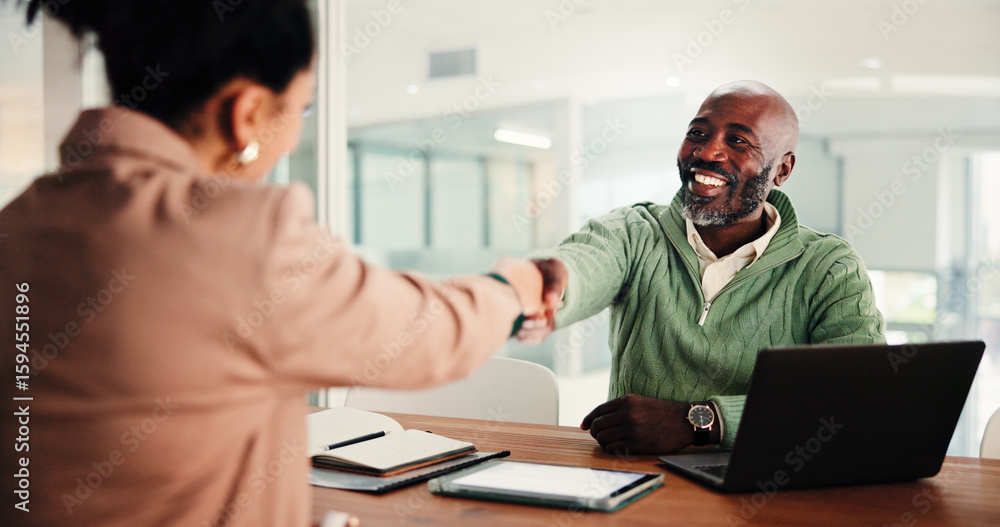 Business man, woman and handshake at interview for recruitment process, agreement or smile at office. People, manager and shaking hands with deal for onboarding, human resources or hiring at agency