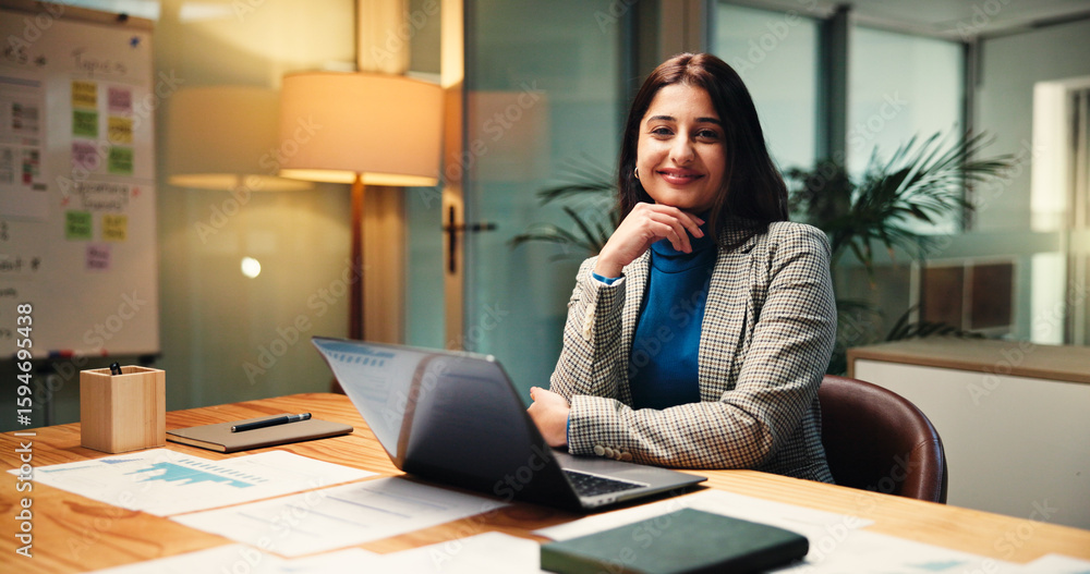 Laptop, portrait and statistics with business woman in office at night for social media analytics. Computer, development and smile of happy Indian employee at desk in workplace for evening deadline