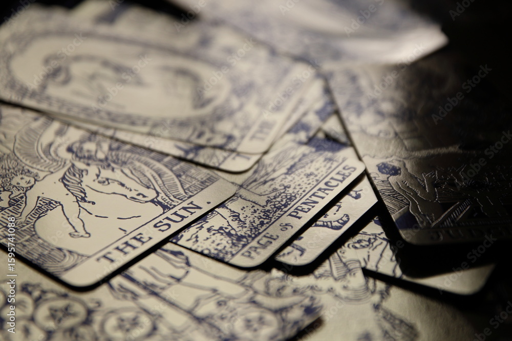 Mystical atmosphere captured through a detailed tarot card arrangement on a textured surface. Rich symbolism and traditional esoteric themes evoke intuition, divination, and spiritual insight. Ideal f