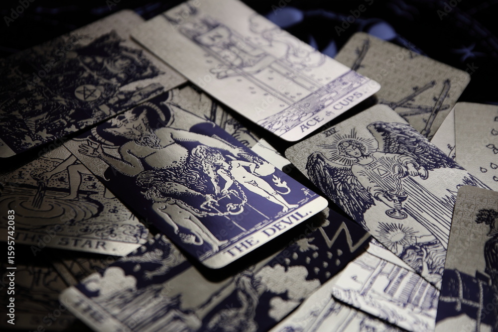 Mystical atmosphere captured through a detailed tarot card arrangement on a textured surface. Rich symbolism and traditional esoteric themes evoke intuition, divination, and spiritual insight. Ideal f