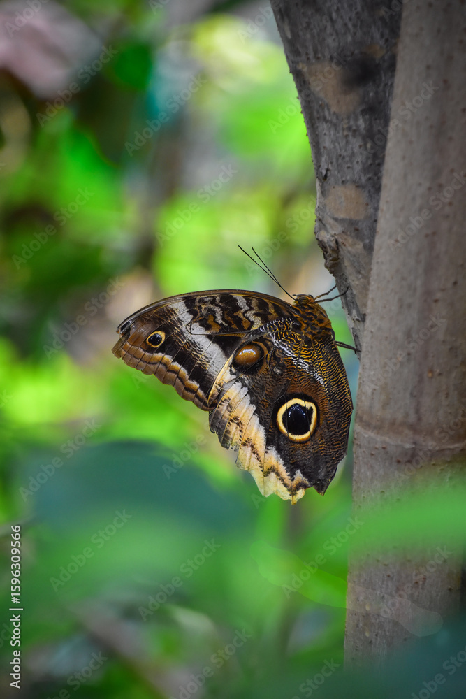 Brown owl butterfly (Caligo) close-up perched on bamboo stem, showing large eye-like wings and delicate textures in nature setting. Shallow depth of field soft blurred background