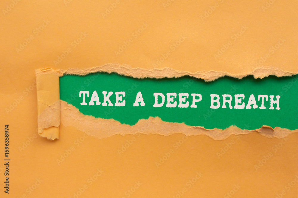 Take a deep breath message written on ripped torn orange paper on green background. Conceptual take a deep breath symbol. Copy space.
