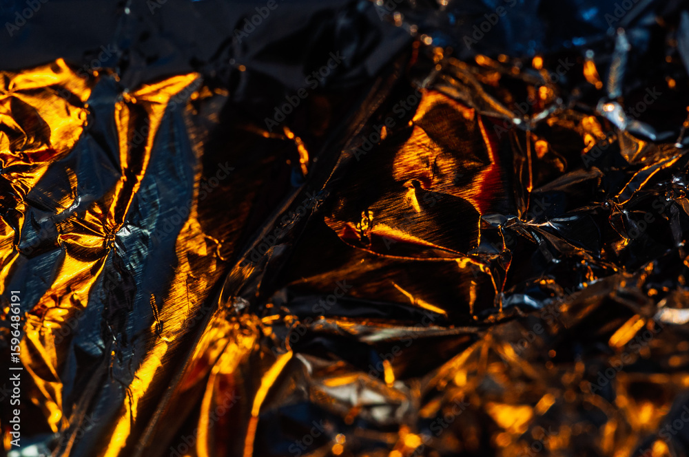 Close-up of crumpled aluminum foil, reflecting warm, golden light. The contrasting shadows and highlights create a dynamic and abstract composition.