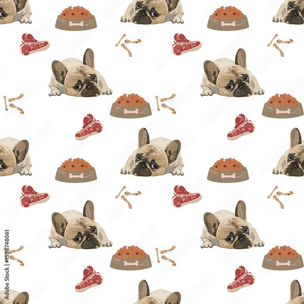 seamless pattern of dogs and foods with plain color background