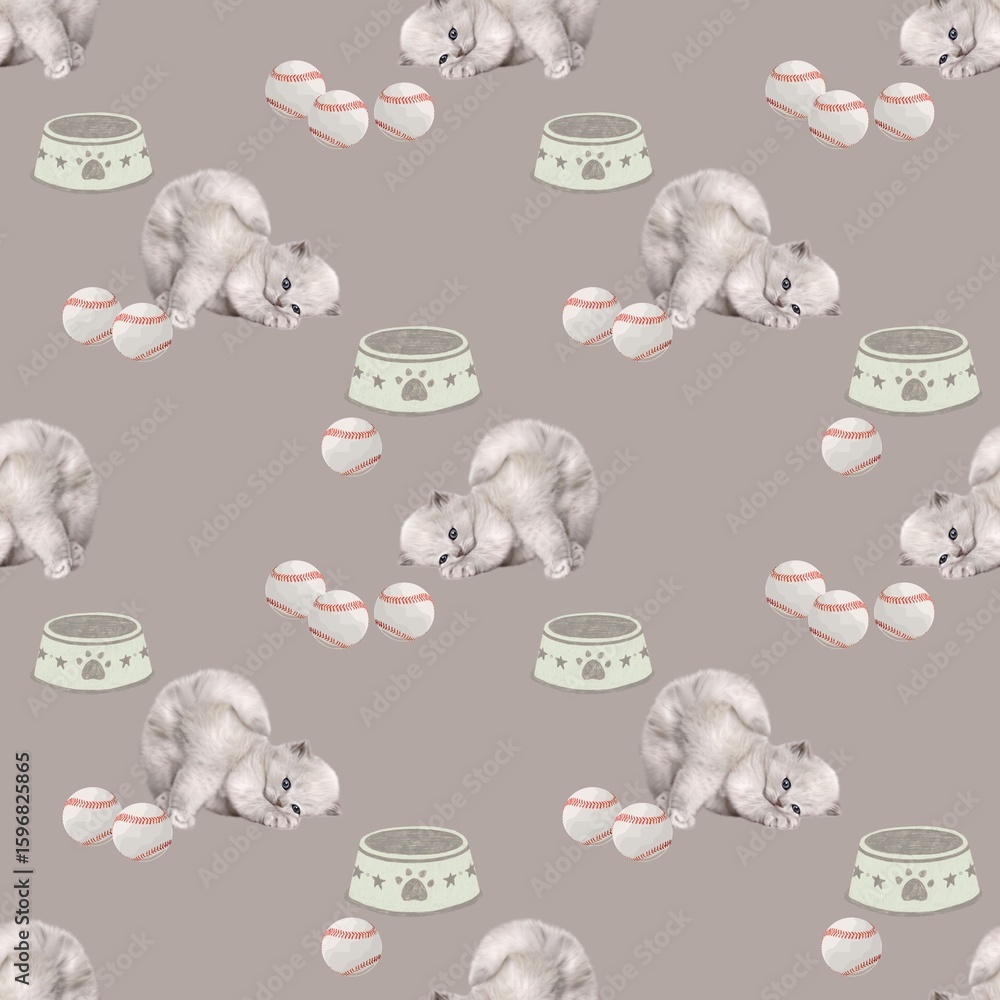 Playful Watercolor Kitten Pattern with Pet Accessories