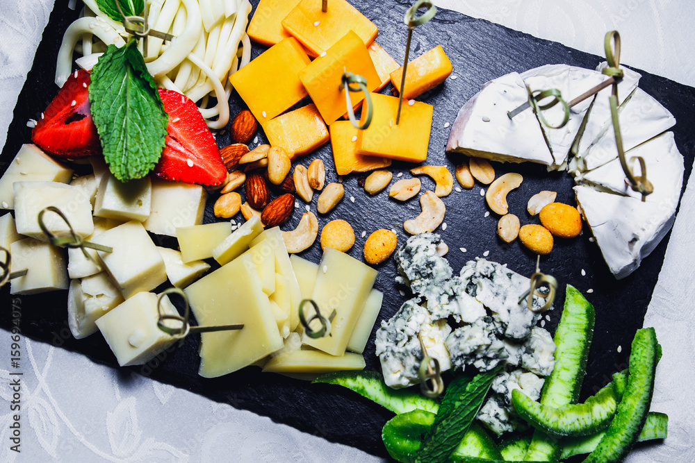 snacks with meat and vegetables. Tapas with salmon and pickled cucumber. Prosciutto with pears and arugula