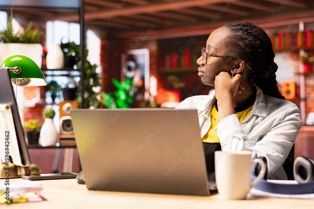 Remote worker pausing work done on laptop at home to pensive thinking. African american teleworker in apartment feeling bored by repetitive tasks, stopping work on notebook to daydream