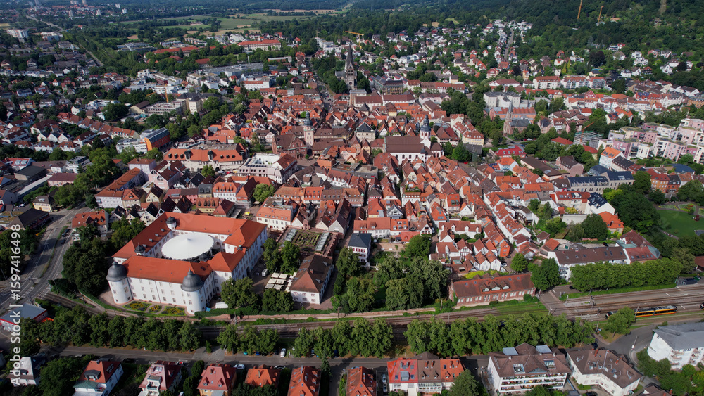 Aerial view around the old town in the city Ettlingen on an sunny spring day