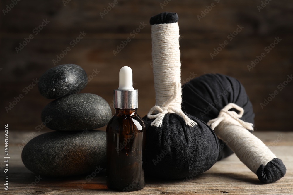 Composition with cosmetic product, spa stones and herbal bags on wooden table, closeup