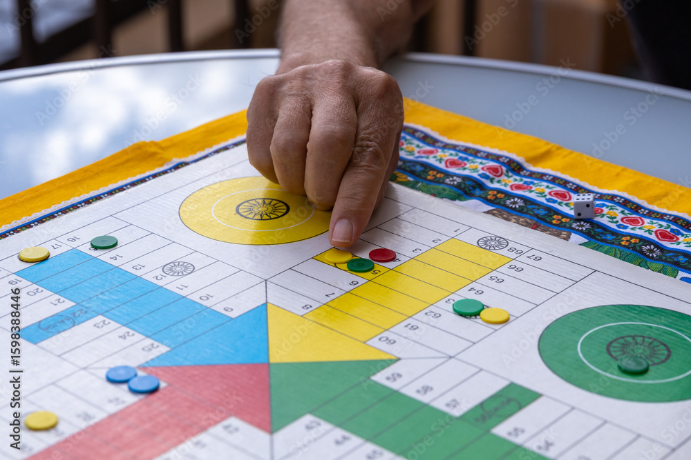 Senior man playing parcheesi, moving red pawn on colorful board