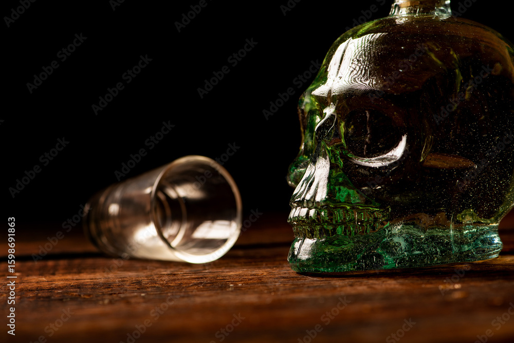 Cachaça, Brazilian cachaça bottle in the shape of a skull and a glass, on rustic wood and abstract background, low key photo, selective focus.