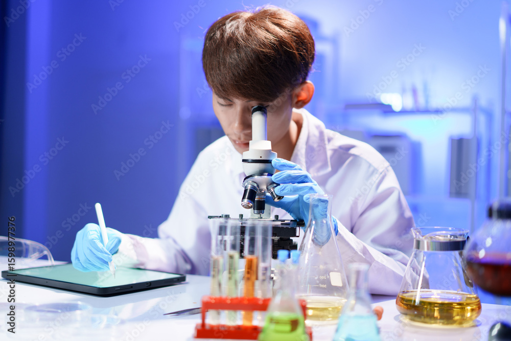 Young scientist looking through a microscope in the laboratory.