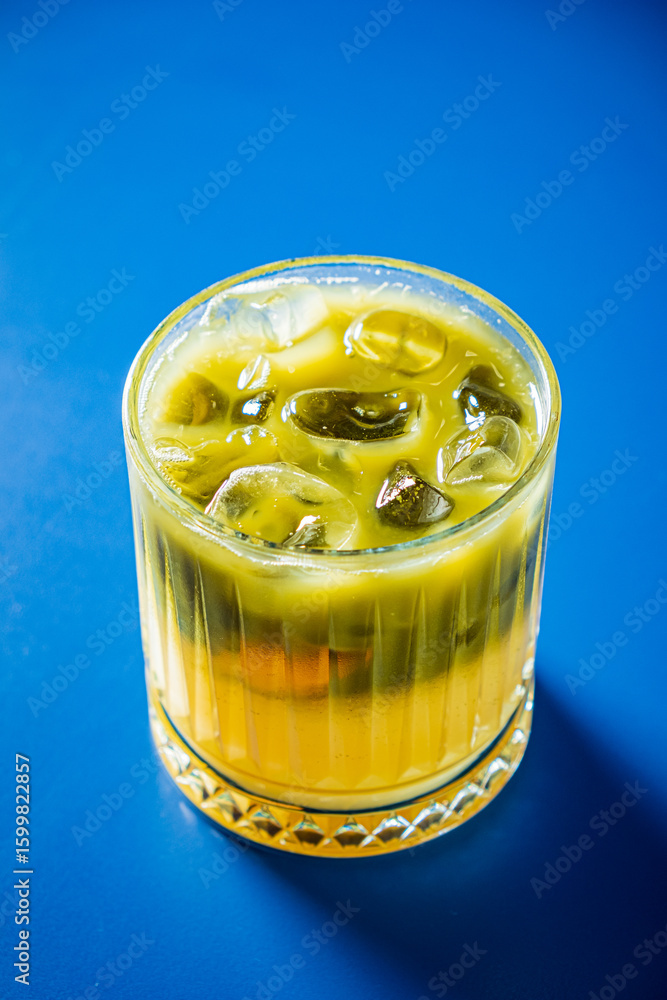 A colorful glass filled with a tropical drink sits on a bright blue surface, inviting refreshment
