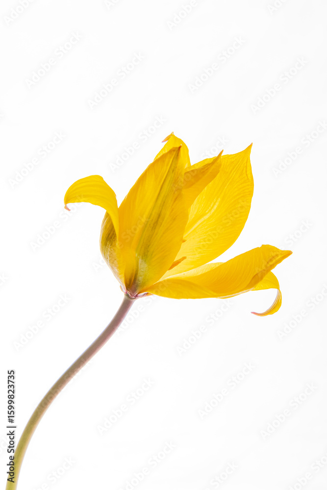 A bright yellow flower opens its petals gracefully in soft light on a clean backdrop