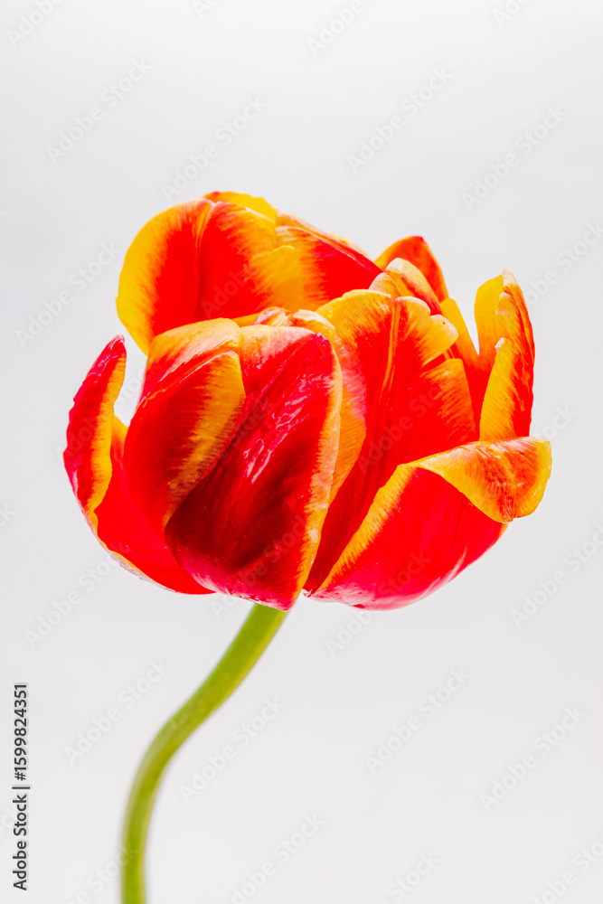 A striking tulip with red and yellow petals rises gracefully, capturing the essence of spring