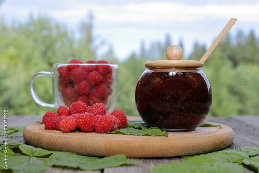 A wooden plate with a glass jar of fresh raspberry jam, heap of berries and a glass mug of ripe raspberries is placed among raspberry leaves on an old wooden table against a summer forest landscape.