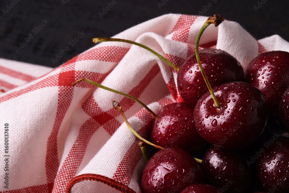 Ciliegie rosse fresche con gocce d’acqua su tovagliolo a quadri