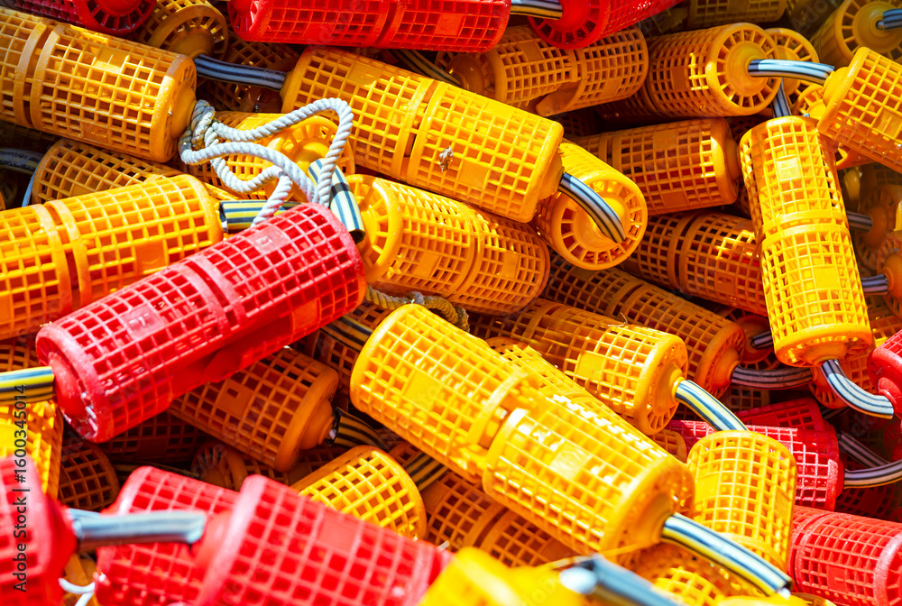 Pile of colorful cylindrical buoys, primarily in red and yellow, with some attached ropes and cables. Buoys are stacked closely together, creating a vibrant and textured pattern under bright lighting