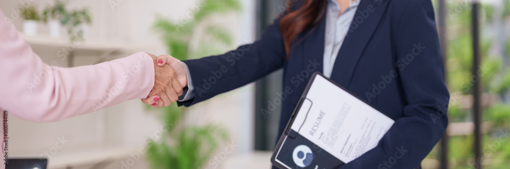 Adult women professional job seekers shaking hands during a successful interview with resume for new career opportunity
