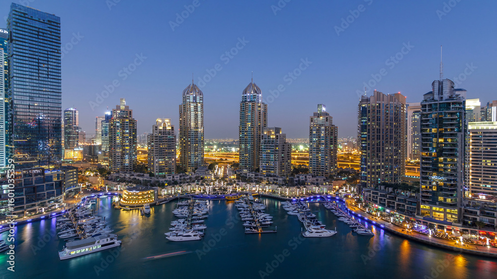 Dubai Marina skyscrapers aerial day to night timelapse, port with luxury yachts and marina promenade