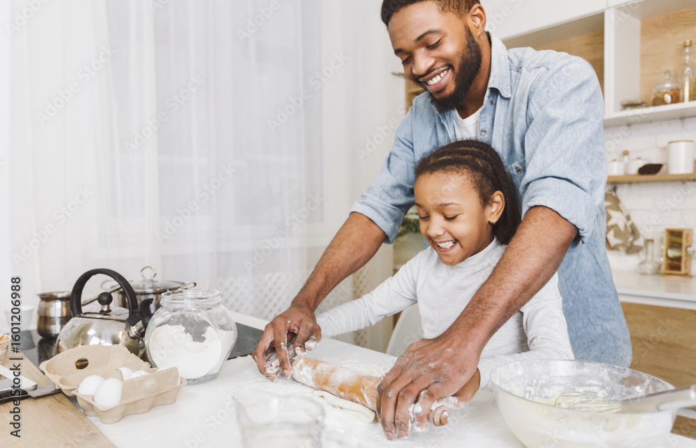 Happy afro man and his child daughter rolling up dough together, having fun. Home bakery concept, copy space