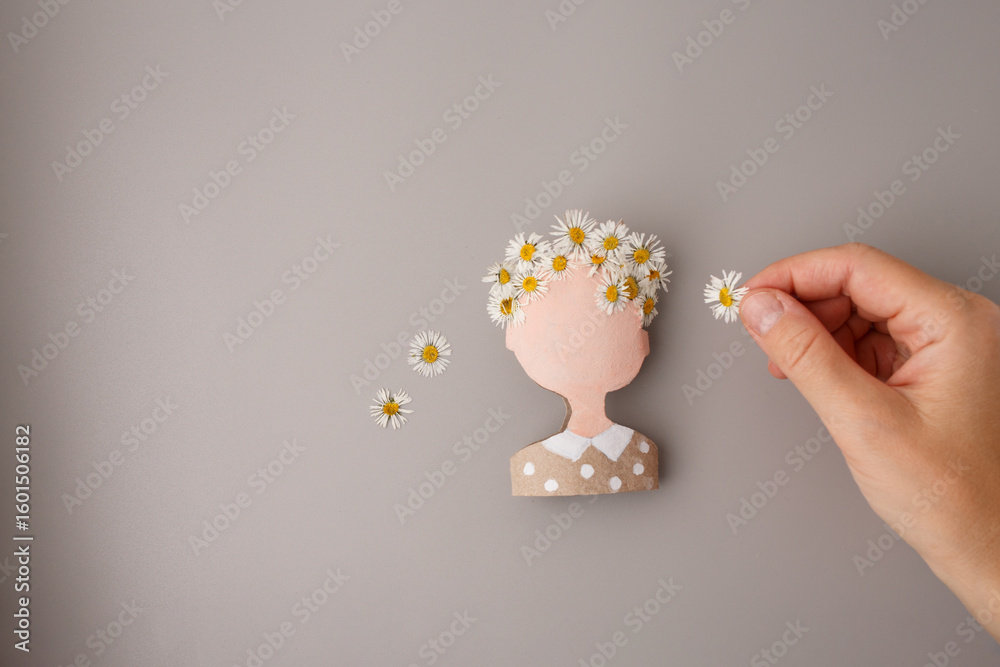 Hand placing daisy on paper doll head with floral crown, perfect for kids craft tutorials, eco education materials, parenting blogs, handmade toy branding, creative workshop visuals,