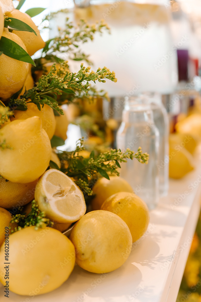 Against the backdrop of a decorated pyramid of citrus fruits and lemons, there are bottles of water for lemonade.