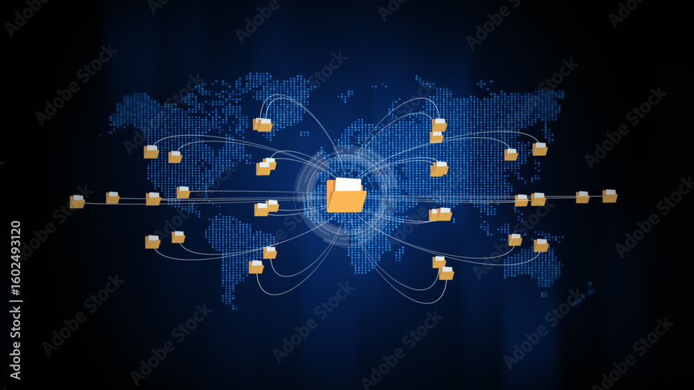 Global data file sharing network showing folders connected over a digital world map, and secure communication. Technology big data digital background. 3d rendering