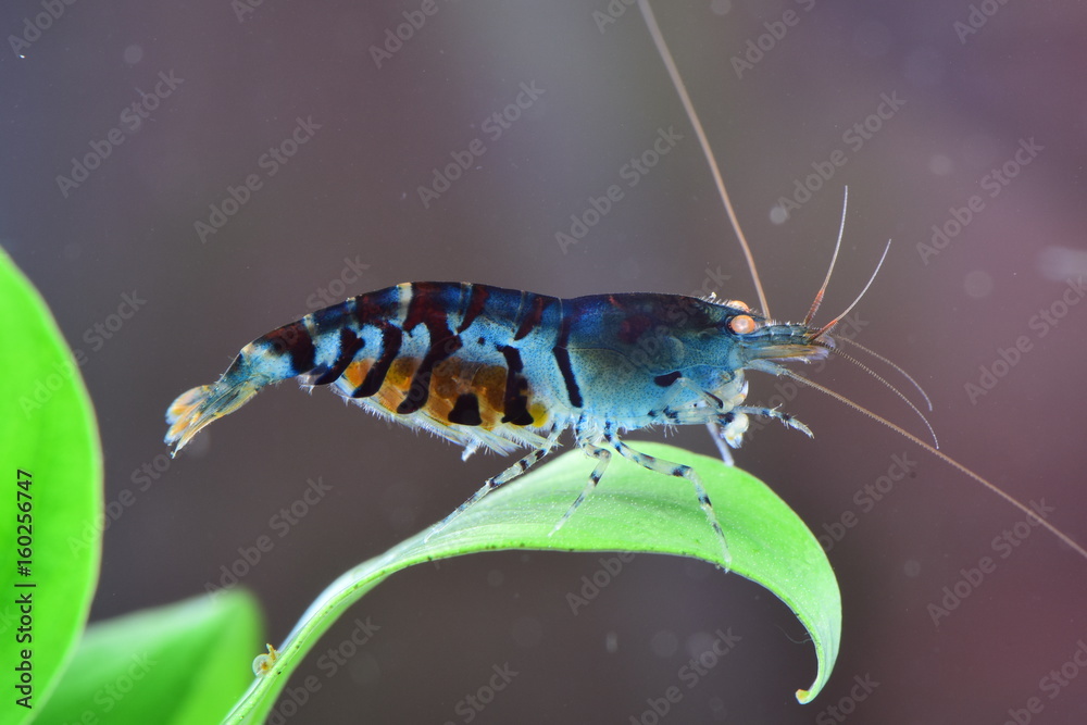 Blaue Tigergarnele mit orangenen Augen tragend auf Blatt
