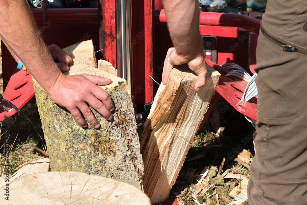 Log splitter in action splitting a thick log, with two people operating the machine outdoors on a sunny day.