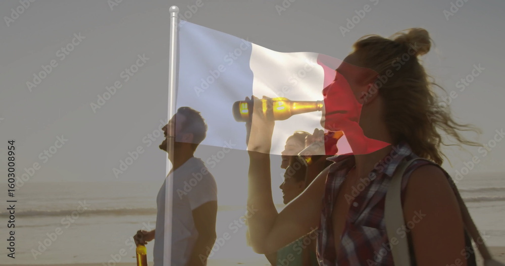 Walking friends holding beer bottles along sandy shoreline at golden hour, with French flag overlay