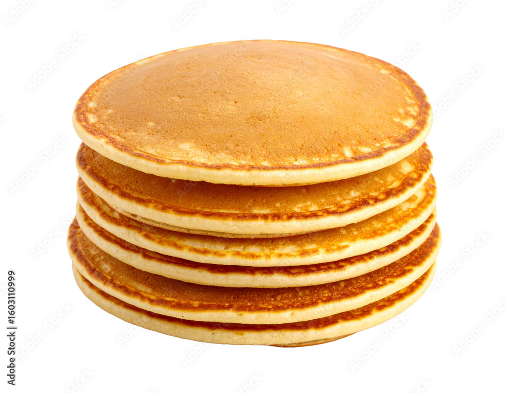 A stack of golden pancakes, inviting and fluffy, isolated on a white background, ideal for breakfast menus.