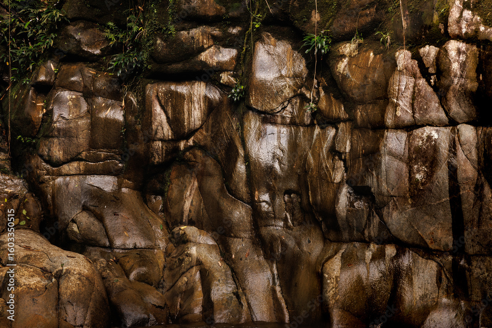 Intrincados detalles de rocas erosionadas por el agua, cubiertas de musgo y pequeñas plantas, revelando la historia geológica de San Rafael, Antioquia, Colombia.
