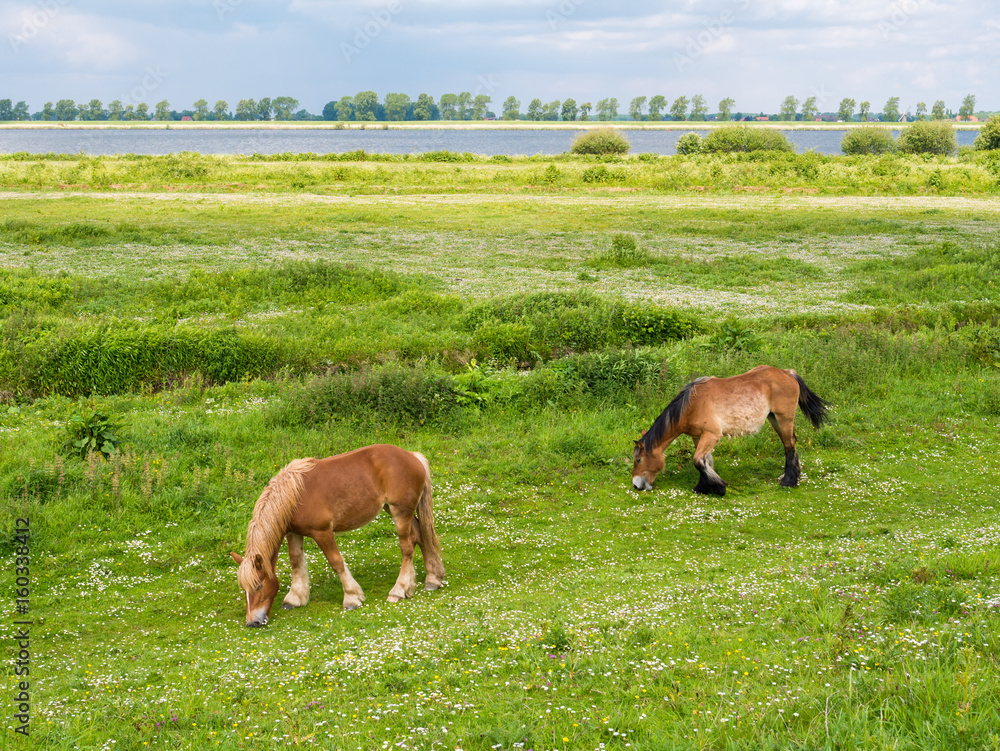 Grazing horses on meadow of Tiengemeten island in Haringvliet estuary, Netherlands